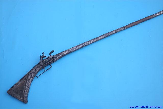 From the island of Sardinia in the Western Mediterranean comes this scarce long gun. Slender barrel, 47 inches long with a fine unusual variety of a Miquelet lock. Wood stock carved on the butt and mounted with finely pierced and engraved steel plates. Total length 59 inches. Very good condition. Lock in very good working order. Minor blackened spots on the barrel. Repaired cracks on the stock. One of the finely pierced steel plate below the barrel is restored. A fine scarce item. |