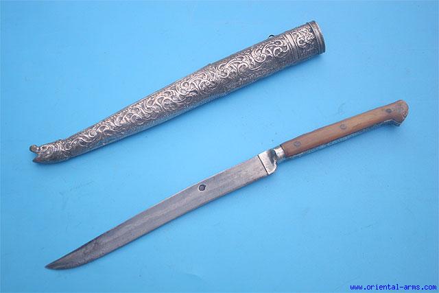 This short knife in the shape of a small Yataghan is of Turkish origin, second half of the 19 C. It is also known as Bichaq. its single edge blade is 7 inches long, forged from laminated steel and marked with the maker sign. The grips are rhino horn, grip strap is silver on tin base and the short bolsters are silver. Finely chased silver scabbard. Total length 12 inches. Very good condition. Chips and losses to the rhino horn. Very low price. |