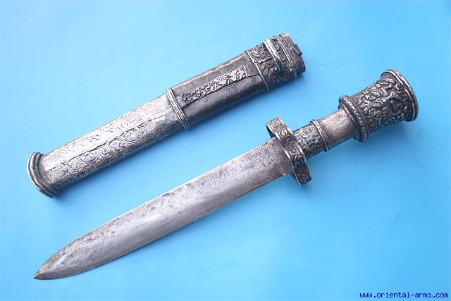 Up for sale is this heavy dagger from Tibet, early 20 C., with a blade forged from old rasp, single edged, 10 inches long. Silver covered handle with big pommel from finely chased silver with Mythological figures. Wood scabbard with big silver mounts, chased in the same style. Total length 15 inches. Very good condition. Handle mounts slightly loose. |