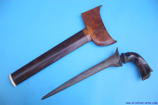 This Bugis Keris Dagger has an old straight blade 11 inches long, with clear pamor structure. The mendak is engraved brass. The massive hilt is carved from beautifully grained wood in a classical Sulawezi style. The scabbard is wood with ivory tip. Total length 16 inches. Very good condition. Minor blackened spots on the blade. Old brazing signs on the ganja. Age crack on the scabbard. |