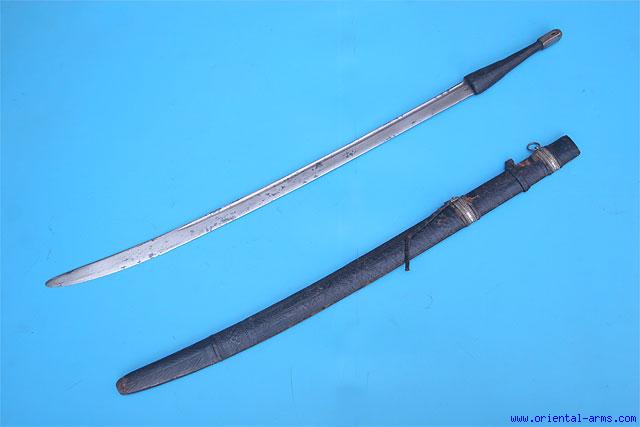 This sword / saber from Oman is a very rare variant of the Kattara classical sword from the same place, see example: Iaroslav Lebedynsky Les Armes Orientales Page 78. The 29 inches fullered blade is of European origin, marked HARVEY. The handle is covered with leather and the pommel is a heavy steel square block acting as a counter balance to the blade. The scabbard is covered with beautifully tooled leather set with two chased silver carrying rings bands. Total length 38 inches. Very good condition. Blade with blackened spots. Minor losses to the scabbard leather. |