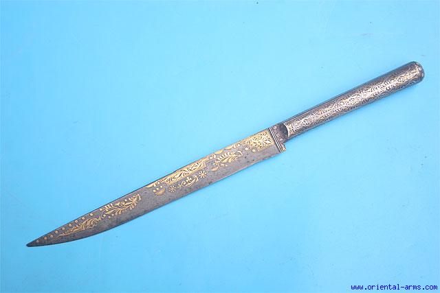 Up for sale is this very fine and attractive knife from the East Mediterranean, probably Balkan or Turkish 19 C. 7 ½ inches single edge blade richly decorated on both faces and on the spine with delicate and gold inlaid koftgari work of the highest quality. Short inscription in Arabic letters on the spine. Steel handle covered almost entirely with gold and silver inlay. Total length 11 ½ inches. Very good condition. No scabbard. |