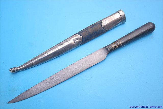 This very fine Kard knife is of Turkish origin, probably early to mid 19 C. It incorporate a very fine blade 8 inches long forged together with the bolsters from very fine Persia Wootz steel of high contrast pattern.. The handle is whole steel with traces of gold koftgari work. This kard comes with its original scabbard, covered with the original blue velvet and mounted with silver locket and chape. The chape is signed with what looks to be a Tughra proof mark for the silver. Total length 13 1/2 inches. Very good condition. Most of the gold koftgari work on the handle is lost. A fine original item with a superb blade. |