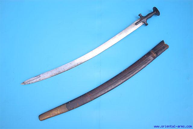 This unusual sword is made in the United Kingdom by Robert Mole and Sons of Birmingham. Mid to late 19 C. Blade 31 inches long, 1 1/2 inches wide. Signed MOLE, BIRMm. Steel hilt in a general style of an Indian Tulwar handle and marked I 771. Leather covered scabbard stitched in a very European style. Brass chape. Total length 35 inches. Very good condition. |