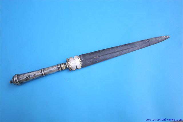 This old dagger is coming most probably from South America, Argentina or Brazil, late 19 to early 20 C. Good blade with central fuller, 8 inches long. Silver handle with brass bolsters set with silver strip. Total length 12 1/2 inches. Good condition. Well patinated blade. Handle lightly dented in several spots. No scabbard. |