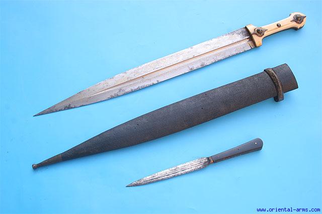 Up for sale is this very fine Qama. The 16 1/2 inches long, of classical offset fullers is richly inlaid with gold work. Grip of walrus / horn slabs with gold inlay on the tang rim. Original scabbard with original black leather cover. This Qama comes with its original short dagger in a compartment on the back of the scabbard (very rare). Total length 23 1/2 inches. Very good condition. A fine and very impressive Qama. |