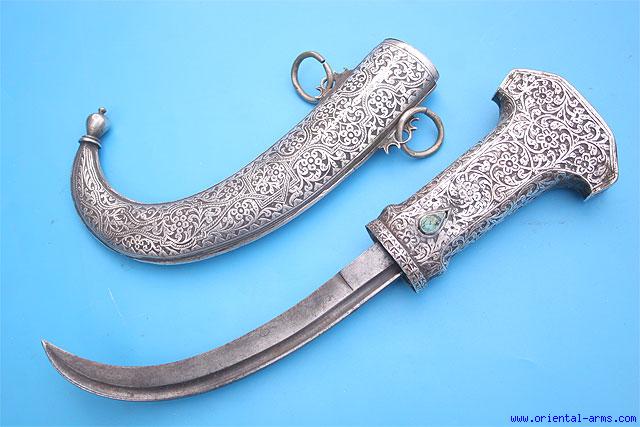This interesting dagger is a rare variant of the Moroccan Koumaya curved dagger. The unusual part is the blade shape: It is heavy, curved, single edge (the edge is on the concave side) with a fuller along the spine. Very much in the shape of a bird of prey claw, (or that of the Velociraptor in the Jurasic Park ). 8 1/2 .inches blade marked with a maker sign. Hilt and scabbard of chased heavy silver, proof marked, in very typical Moroccan design. Handle set with a drop shaped small Turquoise stone. Total length 14 1/2 inches. Very good condition. Minor dents cracks and bents on the pommel side. The silver proof marks are dated but unfortunately too worn identify. Most probably mid to late 19 C. as can be identified on similar items. A very scarce item. |