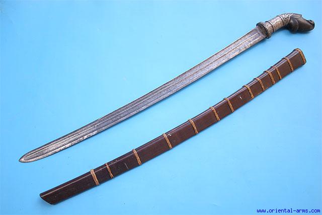 This very good sword is from the family of the Prang and it is coming most probably from Java, Indonesia. It employs a European military blade which was reshaped to fit the size and scabbard common to such swords. Blade length 25 1/2 inches. Carved horn handle with a finely chased silver collar. Wood scabbard bound with braided rattan bands. Total length 32 inches. Very good condition witgh good age patina on the blade. |