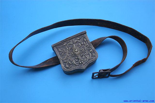 A container to hold bullets, made of chased heavy brass, 3 1/2 inches wide, 3 ½ inches tall with a top hinged lid. Balkan origin, late 19 C. Very good condition. Belt included. Very low price