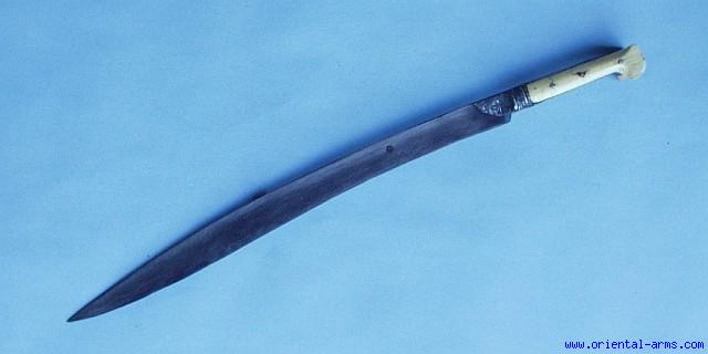 A classical example of a “YATAGAN” sword, probably of Turkish origin. This specific example has a rather short down curving blade, 18 inches long, signed with a maker sign and forged from pattern welded steel (Damascus) in the pattern known as Twisted Star or Turkish Ribbon. This pattern is very common in swords of the Ottoman empire from the 18 Century and on. The grips are ivory and the grip strap is brass covered with a thin layer of silver. No scabbard. Fair condition. There are minor pitting along the lines of the pattern. There are very minor age cracks on the left grip and the right grip is a later addition, hence the different patina tint. Some of the silver covering of the grip strap is damaged. A nice example at a very low price. |