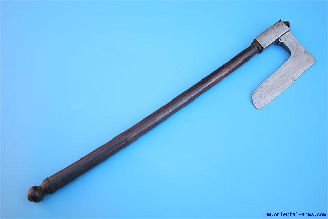 Up for sale is this battle axe, early, probably from central India, late 18 C or a bit earlier. Square heavy blade 5 X 3 1/2 inches forged from laminated steel and mounted on the original hardwood haft18 1/2 inches long. Very good condition, Minor wood chips on the handle. |