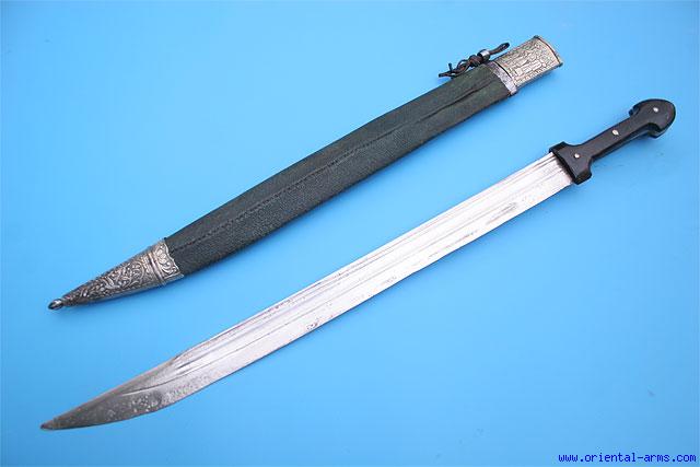 This sword is of Persian origin and it is also known as Quadara. A similar sword is found in central Asian countries and in the Caucasus but sometimes called Qama. This specimen has a 22 inches long single edge blades with a 6 inches false edge. The blade is fullered, marked with an eight point star maker mark. The grips are black Buffalo horn mounted with three rivets over old Persian coins. Original scabbard, covered with dark green ass hide and mounted with chased silver locket and chape. Total length 30 inches. Very good condition. Blade worn with traces of cleaned pitted spots. |