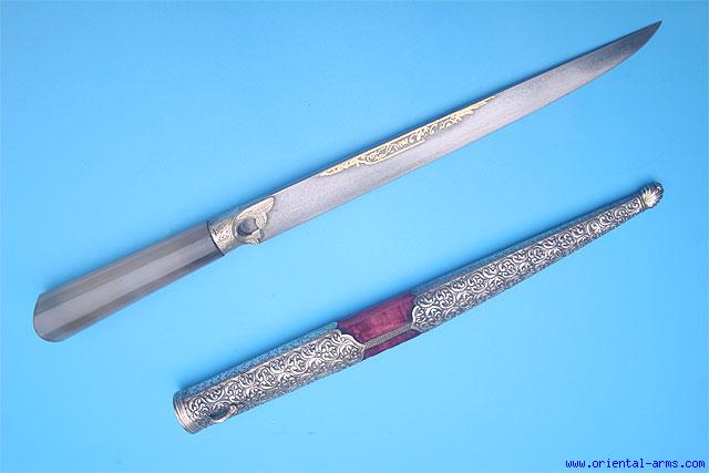 This very fine dagger is Turkish, early to mid 19 C. with a very fine wootz blade 8 1/2 inches long decorated with gold koftgari work. Agate handle set with dark brown stone on the pommel and gilded silver bolster. Original wood scabbard with nicely chased silver locket and chape. Total length 13 inches. Very good condition. |