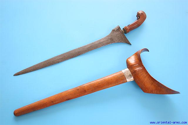 Very good keris dagger from java. Fine blade 15 inches long of very nice and rare pamor structure. Classical grained wood handle and scabbard with a silver band ( probably to cover an old breakage). Total length 19 1/2 inches. Very good condition. Minor old wood chips on the scabbard. |