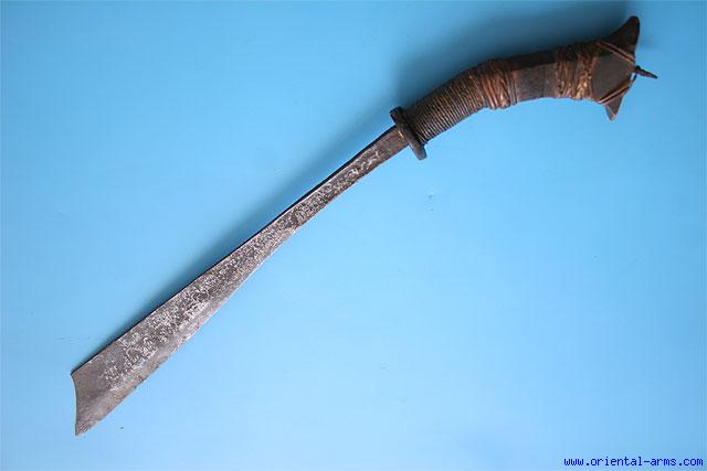 This very rare form of Klewang is from the Molukas islands in Indonesia. It is characterized by the short heavy blade widening to its maximum width near the tip and the down curving handle. This one has a 19 1/2 inches blade, widening to 2 1/2 inches. Clipped tip. Wood handle bound with rattan fibers and a small horn cross guard. Total length 27 inches. Good condition. Patinated blade with some pitted areas. Edge nicks. Minor losses to the rattan binding on the handle. A very rare sword. |