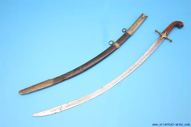 This saber has some characteristics of East European origin. The blade shape, the handle and the handle fittings. Blade 31 inches, nicely fullered and marked with the Eye lashes markings and small stars. Sometime later, some crude engraving of simple flowers was added. Horn grips with brass cross guard and grips strap. Leather covered scabbard with spiral stitching and brass mounts. Total length 37 inches. Very good condition. Repairs on the grip strap. Few repairs and leather replacements on the scabbard. |