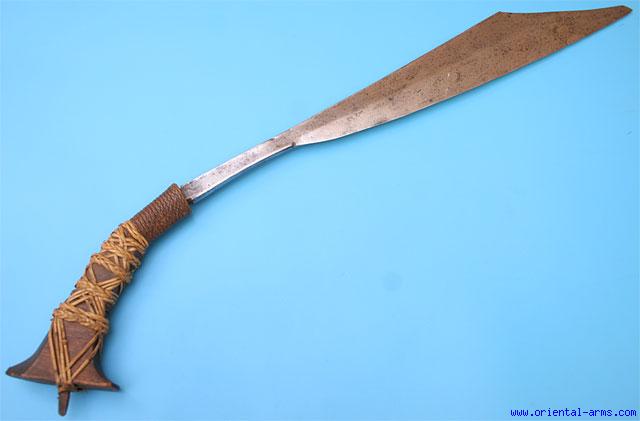 This very rare form of Klewang is from the Molukas islands in Indonesia. It is characterized by the short heavy blade widening to its maximum width near the tip and the down curving handle. This one has a heavy 22 inches blade, widening to 3 1/2 inches. Clipped tip. Wood handle bound with rattan fibers. Total length 31 inches. Very good condition. losses to the rattan binding on the handle. A very rare sword. |