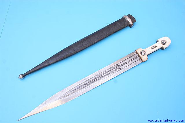A fine Kindjal dagger, probably early 20 C, Degastan. Blade 14 1/2 inches, nicely fullered and finely etched inside the fullers. Handle composed of two grip slab, horn in the front and black horn in the rear side. Grip slabs are riveted to the tang with two rivets, decorated with steel domes finely inlaid in silver (true inlay). Original leather covered scabbard with steel belt ring attachment and steel ball tip also finely inlaid with silver in Degastani motif. A fine Kindjal |