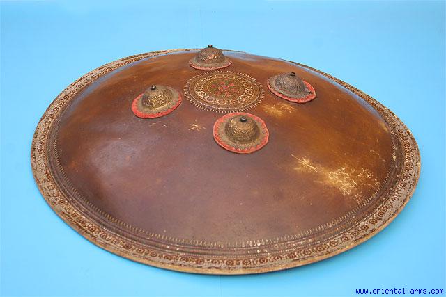 This shield is coming from Rajhastan, India 18 C or a bit later. Made from highly translucent, almost transparent hide of a rhino, 21 inches diameter, very delicately painted with red, green and gold flowers in the center medallion and around the rim both outside and inside the shield. Four big gilded brass bosses set with green stones. Red fabric hand cushion. Very good condition. Some losses to the painting on the outside rim. Torn arm bands. Few later holes drilled around the shield perimeter, most probably for hanging purposes. Very nice and scarce item. |