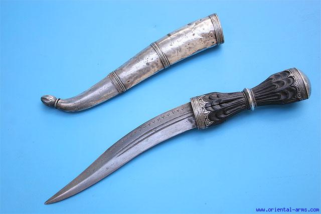 This small fine dagger, although not typical is most probably of Turkish origin, 19 C. Re-curving 6 inches long blade with central fullers and line of star like stamping. Hardwood ribbed handle with fine filigree mounts. Silver scabbard. Total length 10 1/2 inches. Very good condition. Age cracks on the handle. An unusual dagger |