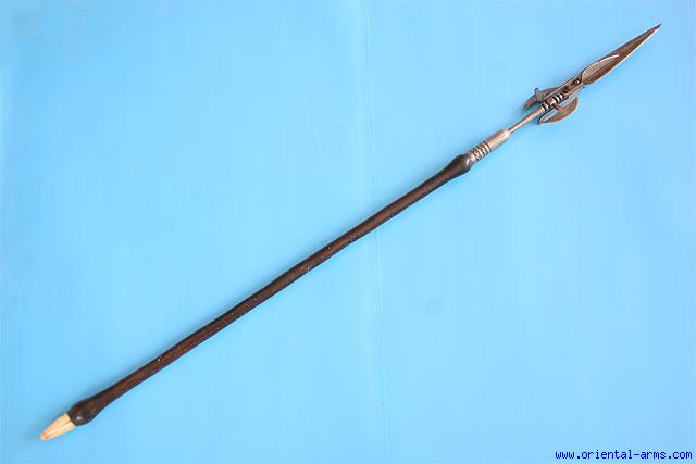 Up for sale is this very unusual spear, origin un clear but most probably North West Sahara, may be Tuareg or Mandingo. The multi blade head has its main blade 7 1/2 inches long with four side blades, all mounted on a 10 inches tang and socket. Fine wood haft with ivory tail. Total length 49 inches. Very good condition. Minor signs of tip bending on the main blade. Excellent shining age patina on the hardwood haft. The attribution to North / West Sahara comes mainly from the file work on the socket and the multi blade head. |