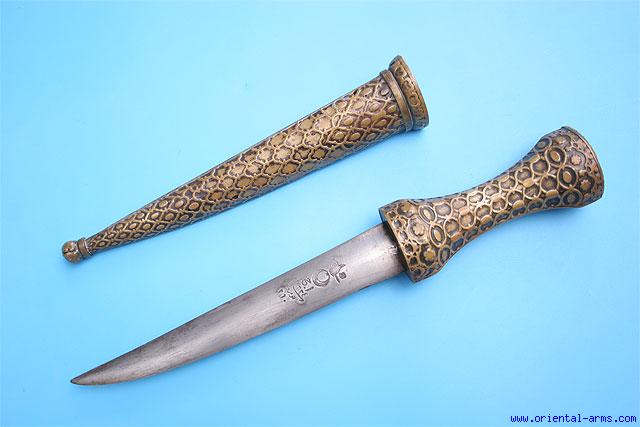 This is a military issue dagger in the shape of an old Ottoman Jambiya from the 16 C (Now in the Topkapi palace museum) These daggers were issued in WW 1, part of the attempt to modern the Ottoman army than under the young Sultan Muhammad V. The blade is 8 ¼ ” heavy, curved and double edged. It has the ‘Tughra’ (the royal stamp) of Muhammad V, the moon and star symbol of the Turkish army, a date 1334 (1915) and a serial number 260 in Arabic figures. On the other side of the blade is a long quote from the Koran. The hilt and scabbard are brass chased in the style of the original dagger. The same serial number is also stamped on the hanging loop of the scabbard. Very good condition. A rare and interesting issue. |