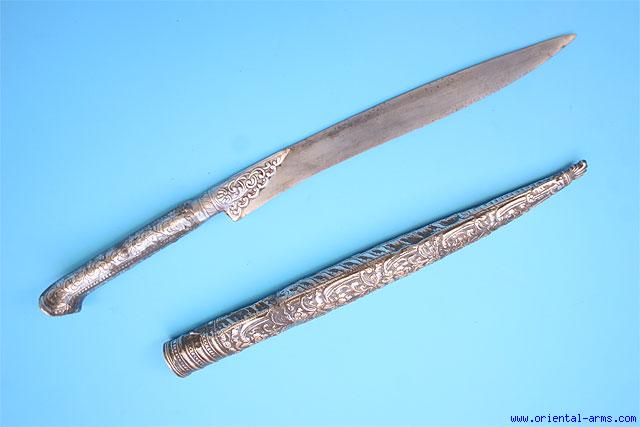 This short knife in the shape of a small Yataghan is of Turkish origin, early to mid 19 C also known as Bichaq. Its single edge blade is 9 inches long, forged from pattern welded steel in the pattern known as Turkish Ribbon. The Handle is covered with engraved silver, The bolsters are silver and the scabbard is finely chased silver with wood liners. Total length 15 inches. Very good condition. Few pitted spots on the blade and repairs on the bolsters. |