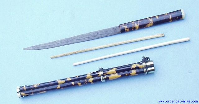 A Chinese ‘trousse’ (eating set), comprising a knife and two chopsticks. This type of sets was very common in china and in all the countries under the Chinese influence from Tibet to Mongolia. It was part of a man formal dress up to the turn of the 20th century and usually accompanied with a variety of accessories like pickle spear, toothpicks, tweezers and the like. Similar sets are found in various sizes and quality. Such sets were quite rare and only recently with the liberalization in China, start to appear in the Western world. This one is of a very good quality one. The blade is 6 inches long, forged from good layer welded (Laminated) steel. The grips and the scabbard are wood covered with tortoise shell like material and the chopsticks are ivory. Very good condition. Age crack in the grip and a small piece of cover is missing. The tip of one of the chopsticks is chipped. It is offered here at a very attractive price, considering its age and quality.