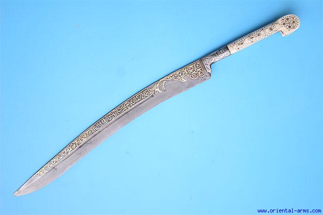 Up for sale is this fine Yataghan Knife / Bichaq from Bosnia Hertzogovina with the blade dated to 1299 (1881 in the Gregorian calendar). Typical Yataghan down curving blade 12 1/2 inches long, finely inlaid with gold and silver koftgari work. Bone grips with brass nails and rondels inserts. Steel bolsters and grip strap decorated with silver koftgari decoration. Total length 17 inches. Very good condition. Few grinding scratches on the blade. No scabbard. The attribution to Bosnia Hertzogovina comes mainly from the typical grips decoration and the date, in which period many knives with similar style where produced. |