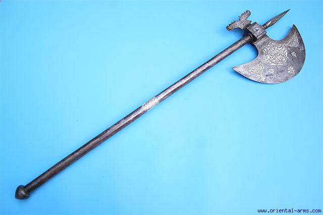 Up for sale is this good battle / ceremonial axe, Indian, late 19 C. Semi circular shaped blade , 8 1/2 inches long 5 inches wide, very finely decorated with silver koftgari work on both faces. Steel haft 24 inches long, ending with a 4 inches spike.. Total length 29 1/2 inches. Very good condition. Impressive and attractive item. |