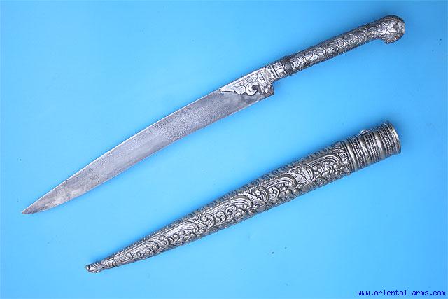 This short knife in the shape of a small Yataghan is of Turkish origin, early to mid 19 C also known as Bichaq. Its single edge blade is 9 inches long, forged from pattern welded steel in the pattern known as Turkish Ribbon. The blade is somewhat crudely engraved in Greek letters STAVERANOS PATEROS ??, probably the owner name The Handle and bolsters are covered with engraved silver, The silver and the scabbard is finely chased silver with wood liners. Total length 15 inches. Very good condition. Few pitted spots on the blade and minor losses on the handle. A very interesting item, coming from the Turkish side and probably ended in the Greek side. |