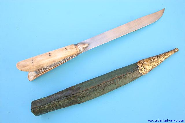 This is a good and typical example of the knife from the island of Crete in the Mediterranean. The 9 inches blade is single edge engraved with a typical design. Handle with bone grips widening toward the pommel in a form of split ears. The bolster and grip strap are chased silver. Wood scabbard covered with green leather with brass chape. Total length in scabbard 16 inches. Very good condition. A nice early to mid 20 C typical Crete knife. |