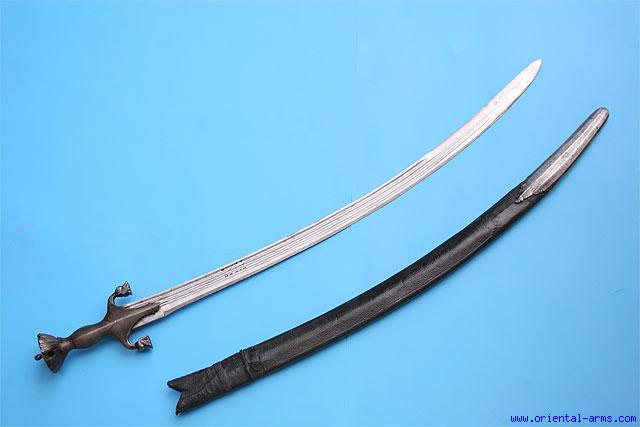 The ‘Pulwar’ is the Afghan relative of the Indian Tulwar. Both may have similar blades but the Pulwar hilt is of very distinct shape, with down curving quillons. This one has a very heavy well forged fullered blade, ¼ inch thick and 29 inches long, with a 9 1/2 inches raised false edge. The blade is stamped with marks. The hilt is of classical shape with faceted grip and ribbed pommel.. This Pulwar comes with its original scabbard with a faceted steel chape. Very good condition. Lightly re shaped blade tip. Minor damaged and repaired areas on the scabbard. A beautiful real fighting sword. |