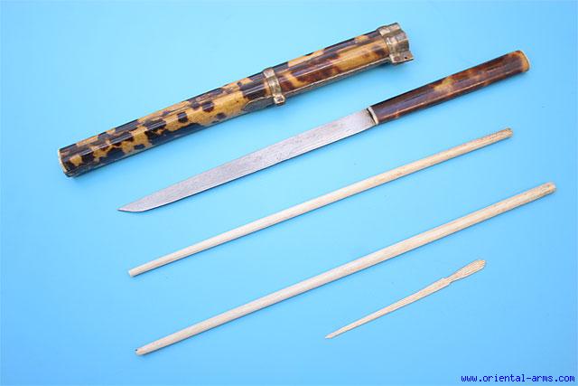 A Chinese ‘trousse’ (eating set), comprising a knife and chopsticks. This type of sets was very common in china and in all the countries under the Chinese influence from Tibet to Mongolia. It was part of a man formal dress up to the turn of the 20th century and usually accompanied with a variety of accessories like pickle spear, toothpicks, tweezers and the like. Similar sets are found in various sizes and quality. This one is a good quality one. The blade is 5 inches long forged from fine laminated steel. . The grips and the scabbard are wood covered with tortoise shell with bone pommel cover and collar, Chopsticks and small pickle spear are bone. Total length 10 inches. Very good condition. |