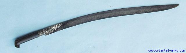 A nice example of a classical “YATAGAN”. The Yatagan derives its shape from very old blades. Its peculiar shaped blade has a down curving blade with reinforced spine, and it is found in many weapons in the eastern world from the West Balkan countries to the far Indian sub-continent. Its eared pommel shape is known from very old days and similar pommels were found in swords from Luristan 3000 years ago. This specific example is of Turkish origin, has a 23 inches long blade finely forged from pattern welded (Damascus) steel core, cold welded between high Carbon steel spine and edge. The Damascus pattern is known as twisted star or Turkish ribbon pattern. This pattern was known since the 17th C and it is employed in many Turkish / Ottoman blades. The grips with the side ears are carved from black horn. The blade collar and grip strap are chased silver. Good condition. Few pitted spots near the blade tip. The grip strap and one of the bolsters are slightly damaged. The pommel ears tips has minor horn chips. A very nice example at a very low price.