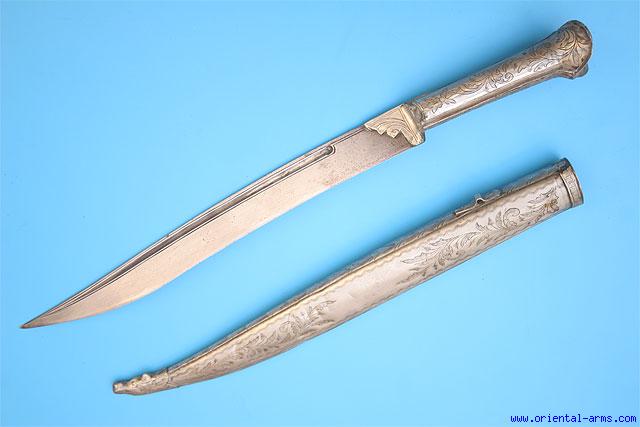 This knife is coming from Trabazon area, on the shores of the Black Sea, north Turkey. Late 19 to early 20 C. Big size, 12 inches blade very well forged (probably from an old file) beautifully fullered with a filed and nicely decorated spine. Finely engraved white metal handle and scabbard. Total length 18 inches. Very good condition with minor dents on the handle. Impressive knife |