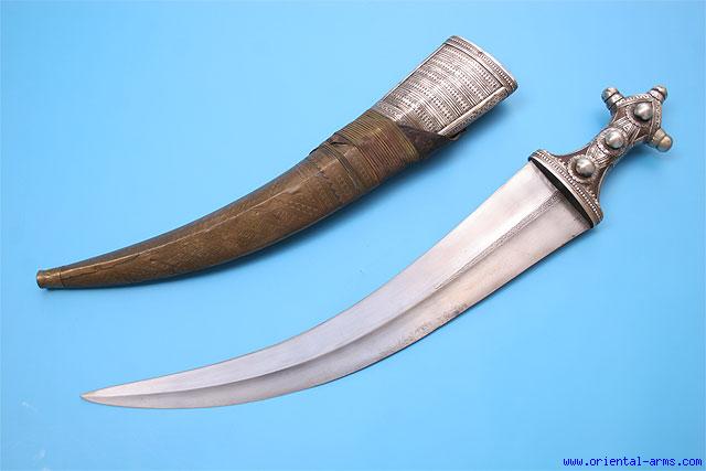 This massive Jambiya dagger is early 20 C. coming from the Western regions of Arabia, Hijaz and Asir. The big and heavy blade is 16 inches long, 3 inches wide, very well forged with a shallow central rib. Horn grip mounted with heavy silver mounts all around. The scabbard is covered with brass and silver and the belt attachment is bound with twisted brass wires (belt itself missing). Total length 22 inches. Very good condition. A massive and very impressive authentic dagger. |