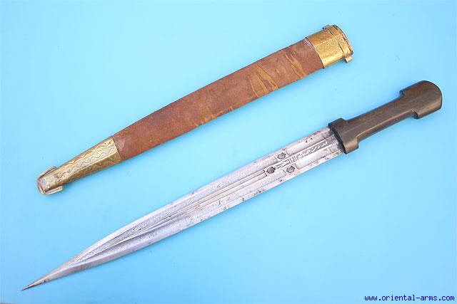 This dagger is Turkish, kindjal style with a fine fullered blade, very clearly stamped with the maker name in three places and dated to 1312 (1894 in the Gregorian calendar). The blade is etched in an interesting unusual design in an attempt to imitate pattern welded steel. Blade length 14 inches. Black horn grip. Wood scabbard covered with fabric and mounted with brass locket and chape (later). Total length 19 inches. Very good condition. |