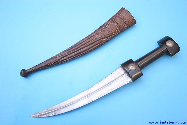 This is a classical Jambiya dagger of the Kurdish people. Probably east Turkey, early 20C. Double edged curved blade with a central rib 10 inches long. I shaped grip from black horn with four silver domes made from old Turkish coins dated 1327 (1909 in the Gregorian calendar), riveting the handle to the blade. Wood scabbard covered with finely tooled leather. Total length 17 1/2 inches. Very good condition. |