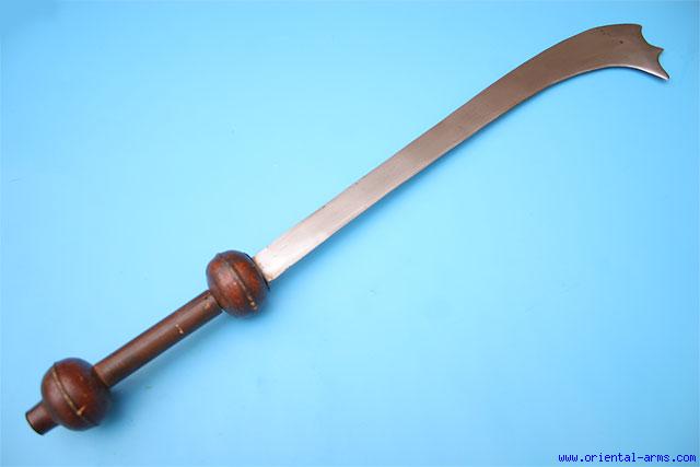 This Kora sword is Indian, late 19 C., with good down curving blade sharpened on the concave side and on the tip as well. The handle is unusual, wood cylindrical grip with two wood balls serving as cross guard and pommel. Blade length 21 inches. Total length 29 1/2 Inches. Very good condition. Good age patina on the wood balls. Add 18.00 Dollars for air mail shipment. |