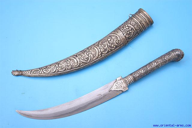 This rare dagger is Turkish, dated to 221 (probably standing for 1221, which correspond with 1806 in the Gregorian calendar). It is a very fine mix between the double edged curved Jambiya (or Khanjar) and the Bichaq knife. The fine blade is 9 inches long, constructed from a twisted steel core forge welded between high carbon steel edges. Similar construction is known from Yataghan swords from the period. The blade is dated 221 (see above). Silver on pewter base handle with classical eared pommel. White metal scabbard. Total length 14 1/2 inches. Very good condition. Very rare and interesting item. |