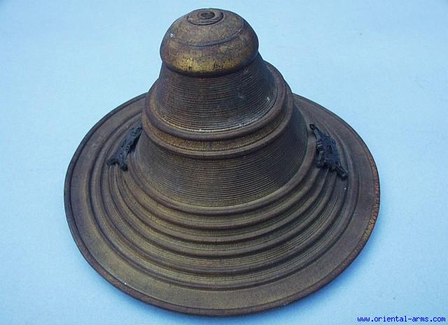 This is a Buckler (hand shield) from the horn of Africa. It is 10 inches in diameter, 8 inches in height and it is made from the hide of the Hippopotamus. It is more than 5/8 inches thick and so though that it will stop a bullet from a small caliber pistol. The attached fittings are silver. These type of shields were sought after in all the area and were traded all the way through Zanzibar to Oman. |