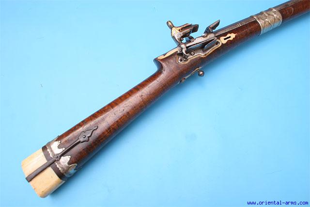 We offer here this fine Caucasian Miquelet Rifle. The barrel is 43 inches long forged from fine twisted Damascus steel, clearly visible on its entire length. The lock is a Miquelet type decorated with gold inlay. The stock is made of beautifully grained walnut with silver mounts and ivory inserts. The butt is carved from a solid piece of Walrus ivory. Total length 56 inches. Very good condition. Lock in working order but needs a minor adjustment. The top screw of the hammer is restored. The back strip of the barrel is cracked but holds firm. Several silver bands are later replacement. |