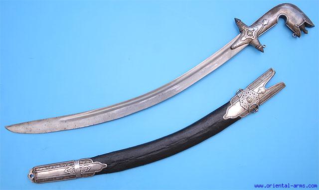 This Saif is a very rare version of Arab sword from the South Arabian Peninsula. A fine heavy sword, with a 26 inches long single edge fullered blade with an 8 inches back edge. The blade is forged from fine wootz (Damascus) steel, and it is most probably a secondary use of an 18 C. Persian blade. The hilt and cross guard are later, early to mid 20 C., whole silver in a typical form reminding in a way the hilt of the Moroccan Nimcha sword. The scabbard is wood covered with black leather with big silver locket and chape. Total length 32 inches. Very good condition. Minor losses and repairs to the leather. A very fine piece. |