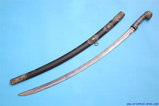 This fine Shashqa sword is late 19 C. 31 1/2 inches finely fullered blade with etched design at the blade top. Chased and nielloed silver handle and en suite scabbard fittings. Total length 37 1/2 inches. Very good condition. A small forging flaw on the blade. Minor dent to the scabbard tip. All parts original as made. No repairs or replacements. |