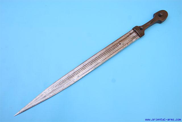 This good kindjal dagger has a 17 inches blade, finely fullered and stamped with a maker mark. Horn grips with steel rivets. Total length 22 1/2 inches. Very good condition.grinding scratches on the blade and minor age crack on the rear grip. No scabbard. Very low price. Excellent purchase for a restoration project.