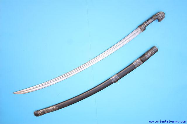 This fine Shashqa sword is late 19 C. 32 inches finely fullered blade with etched design at the blade top and deep maker mark. Chased and finely blued silver handle and en suite scabbard fittings. Total length 38 1/2 inches. Very good condition. All parts original as made. No replacements.