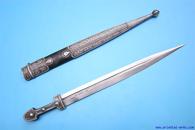 Up for sale is this very good big Qama / Kindjal dagger dated to 1324 (1906 in the Gregorian calendar) The blade is 16 inches long, finely fullered in the classical off centered fashion and the maker mark (OSMAN in Cyrillic letters) deeply stamped in the blade. Horn grips with finely chiseled and nielloed front cover and granulated silver grip strap, en suite with the scabbard mounts. There is a nielloed inscription the locket back side, Arabic letters and the date. Total length 22 inches. Very good plus condition.