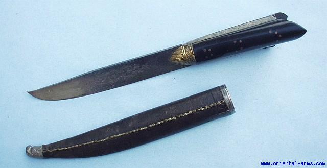 This is a very good and typical example of the knife from the island of Crete in the Mediterranean. The 7 inches single edge blade, typically engraved and mounted with black horn grips widening toward the pommel in a form of split ears. The bolster and grip strap are engraved brass. Wood scabbard covered with leather stitched in the spiral stitching common in the Ottoman Empire in the secong half of the 19 C. Total length in scabbard 12 inches. Excellent condition! , All parts original and in excellent shape. No replacements or restorations.