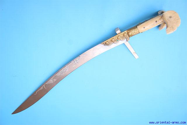 Fine Ottoman Balkan Yataghan sword with very big walrus grips and pommel ears dated to 1289 (1872 in the Gregorian calendar). Massive 23 inches blade with silver koftgari work – Inscription in Arabic letters and the date. Massive walrus grips, original complete and in perfect shape (not cracked as commonly happen with such swords). Chased and gilded bolsters and grip strap set with small pearls and turquoise stones. Next to perfect condition. Grips very slightly loose due to age shrink of the ivory. A very impressive sword. |